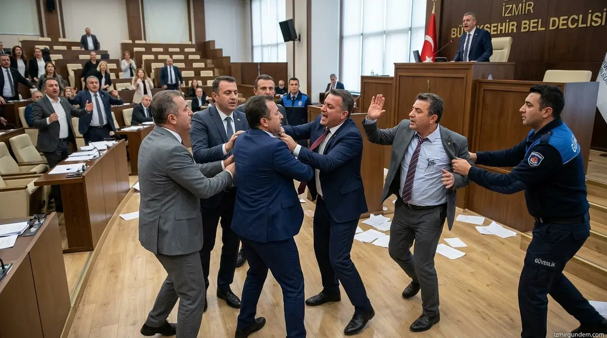 İzmir Büyükşehir Belediyesi 2025 yılı faaliyet görüşmelerinde tansiyon yükseldi. CHP'nin yeterlilik önergesi sonrası AK Parti ve MHP gruplarıyla yumruklu kavga çıktı.